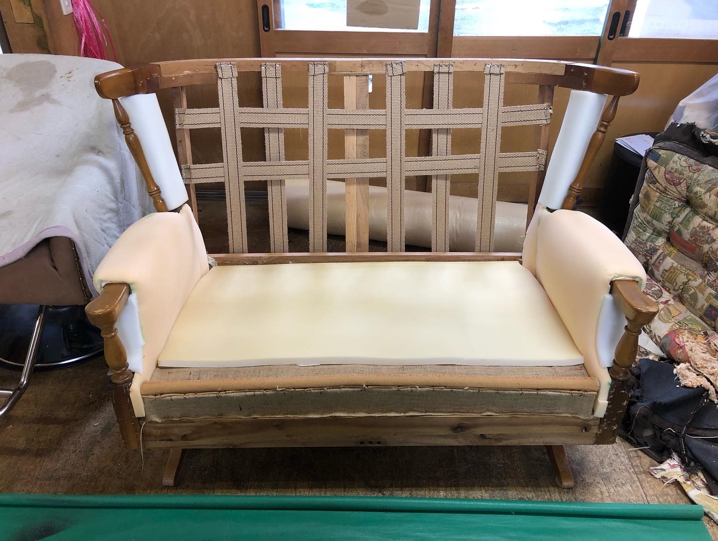 アメリカビンテージのロッキングチェアの張替えをしました。 とても珍しいタイプのソファーでした。 布地は ウィリアムモリスのスネークヘッドベルベットです。 クッションも新品に交換しました。